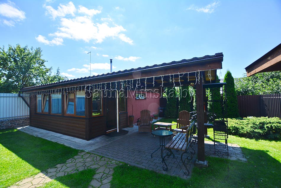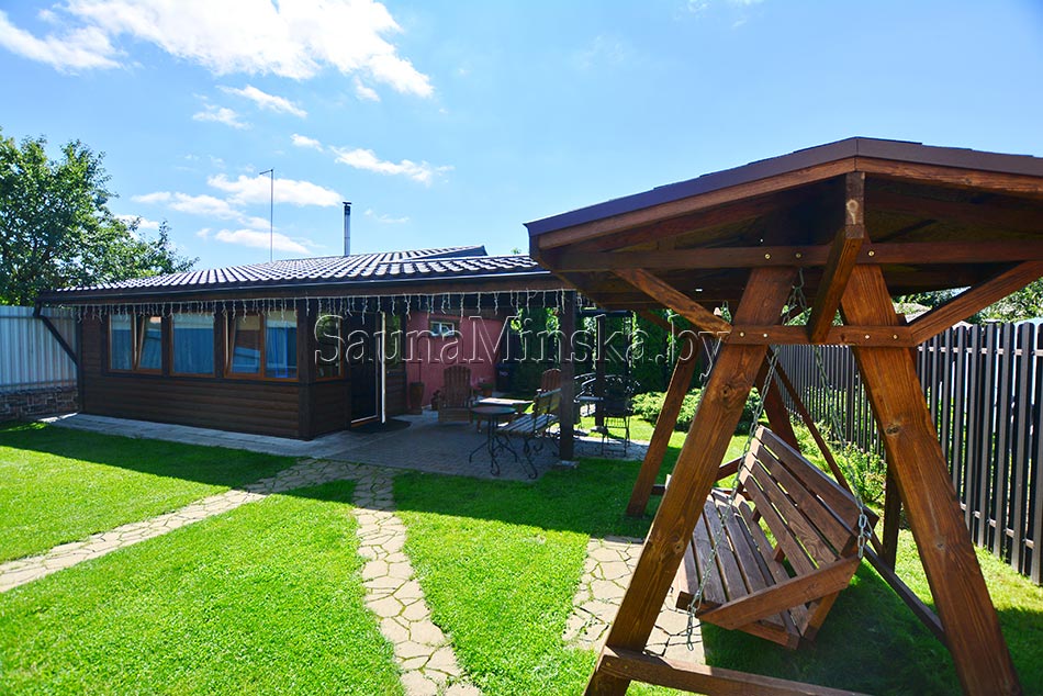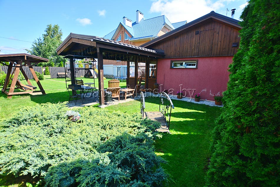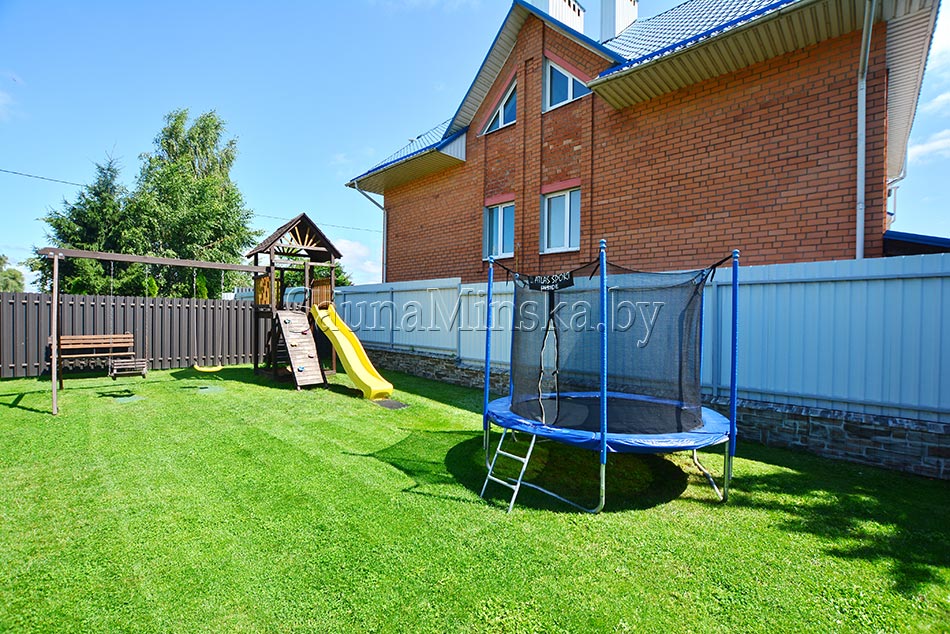 - На территории есть уютный дворик, мангал, детская площадка с батутом и качелями.
