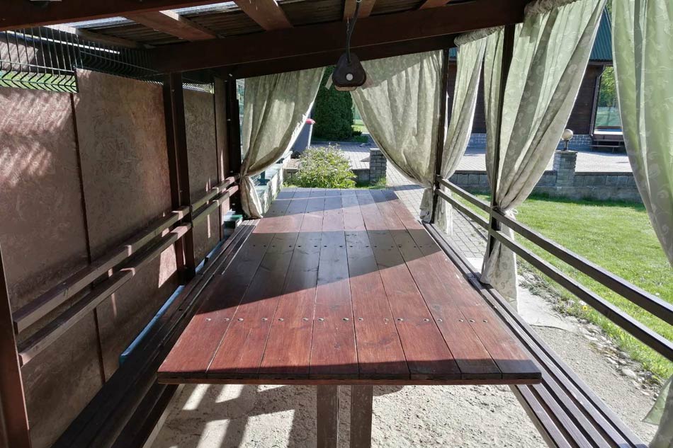 Беседка расположена в тихом уединенном месте недалеко от водохранилища Вяча в деревне Дофаренция, что в 10 км. от Минска. Для отдыха тут есть огороженная с ландшафтным дизайном территория, беседка с освещением и банкетным столом. Так же тут вы можете посетить русскую парную на дровах, остановиться с ночлегом, провести любые мероприятия.