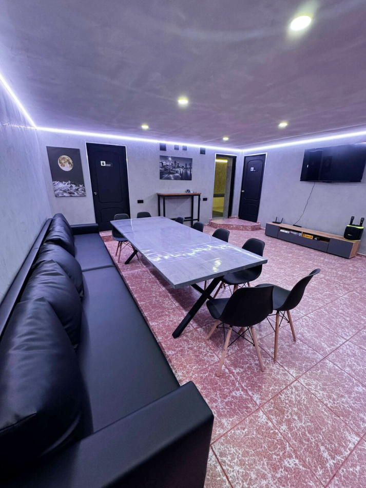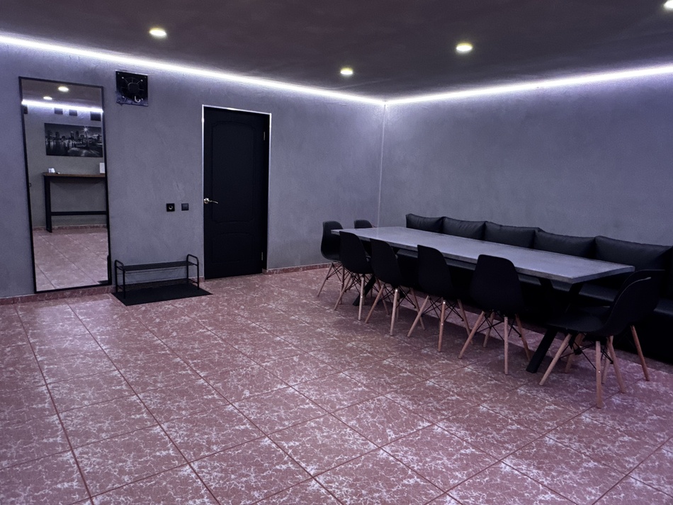 Банкетная зона на 15 человек, кухня с холодильником, микроволновкой и полной сервировкой посуды.