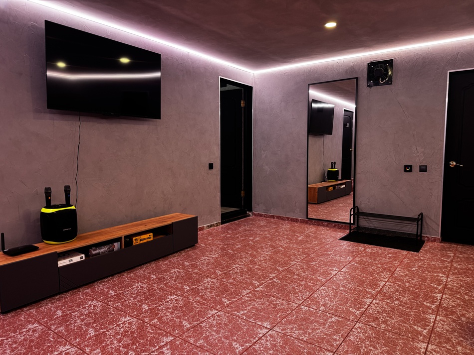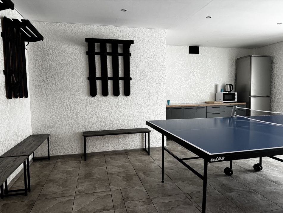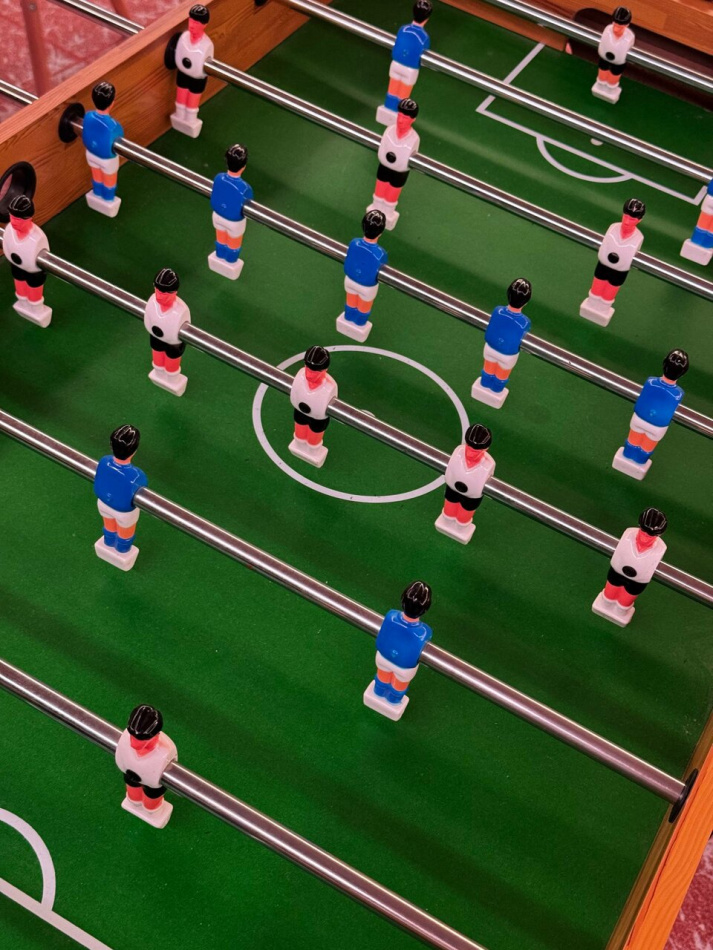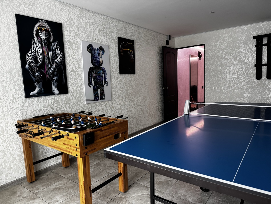 Караоке, телик с Алисой, настольный теннис и кикер.