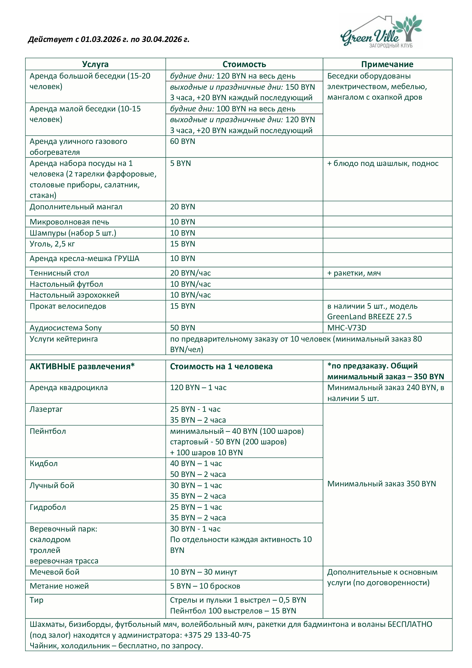 Загородный клуб «Green Ville» (Грин Вилль) рядом с Минском в 13 км. от МКАД – это тихое место в сосновом лесу на территории бывшего детского лагеря имени Олега Кошевого. Здесь вы сможете насладиться всеми благами загородного отдыха, отдохнуть душой и телом от городской суеты, организовать любые мероприятия любого уровня и формата. Здесь вам помогут воплотить в реальность все ваши пожелания.