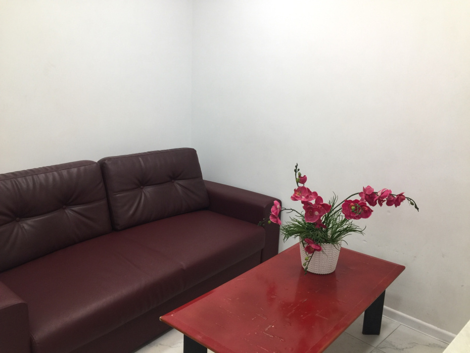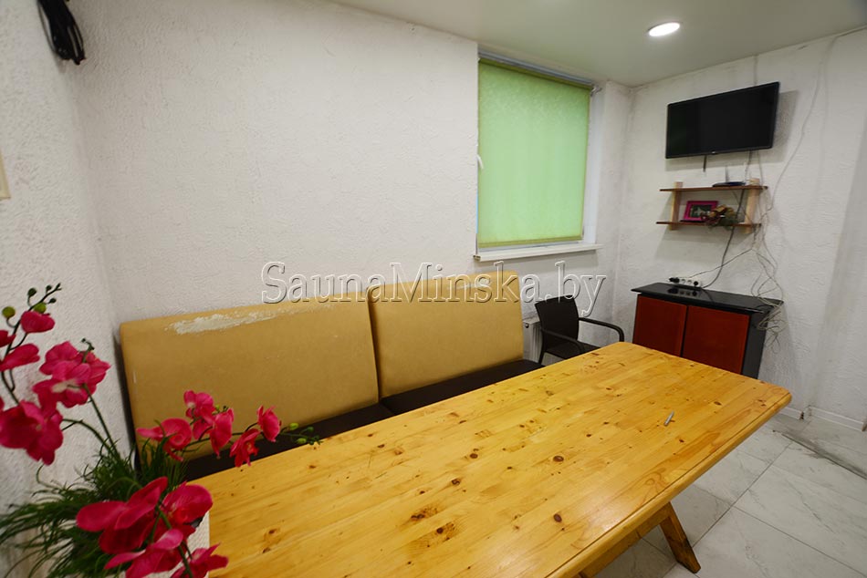 Для расслабления и релакса имеется отдельная комната отдыха. В ней расположен кожаный диван, при необходимости может трансформироваться в большую кровать (для самых уставших), журнальный столик, микроволновка, чайник, мойка.