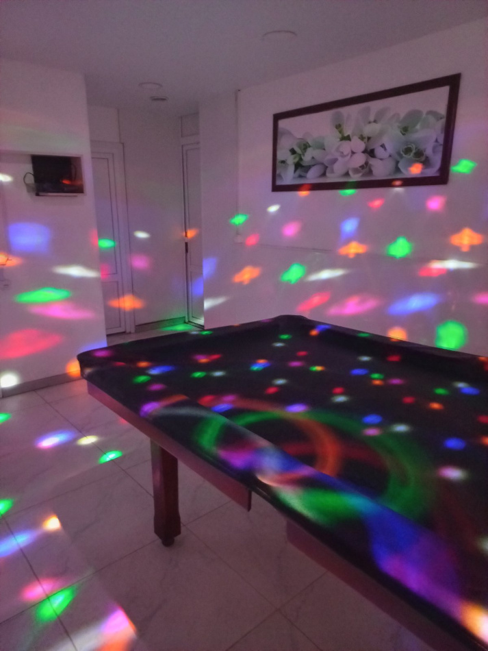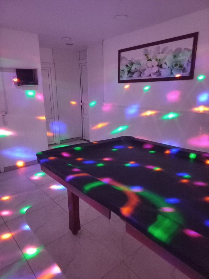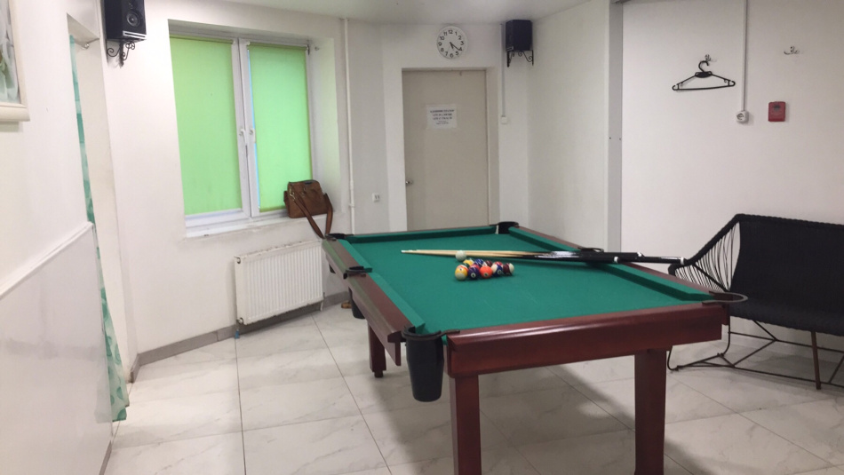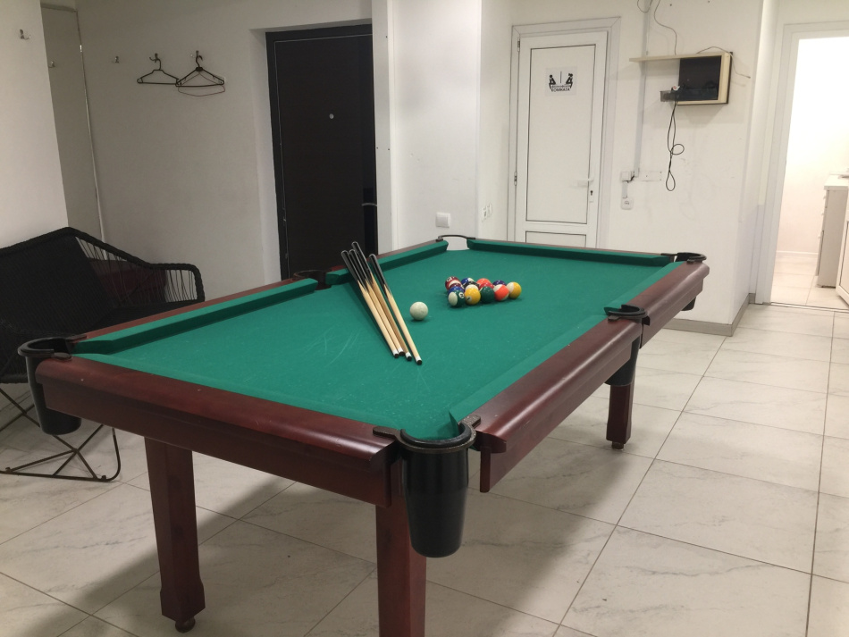 Комната отдыха с бильярдным столом (американка), плетёным диванчиком, зеркало во всю стену, фен, блютуз-колонки и свето-музыка.