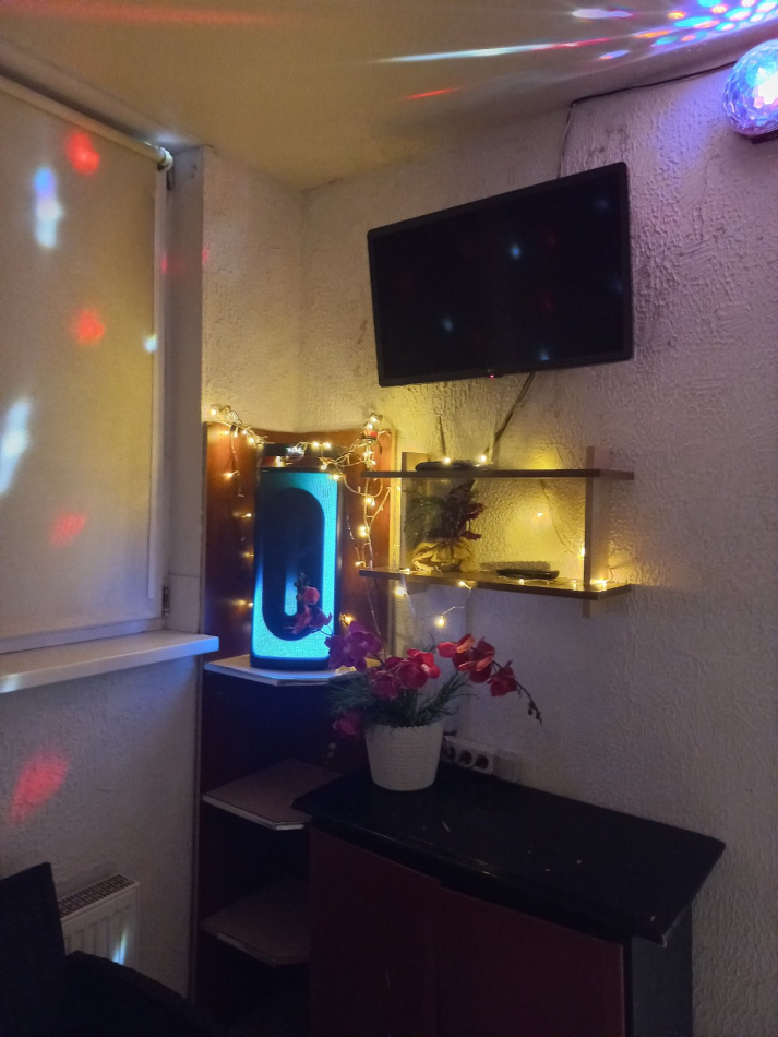 Банкетный зал: в нем установлен большой кожаный диван, деревянный стол для большой компании, телевизор 55 дюймов, блютуз-колонка, светомузыка.