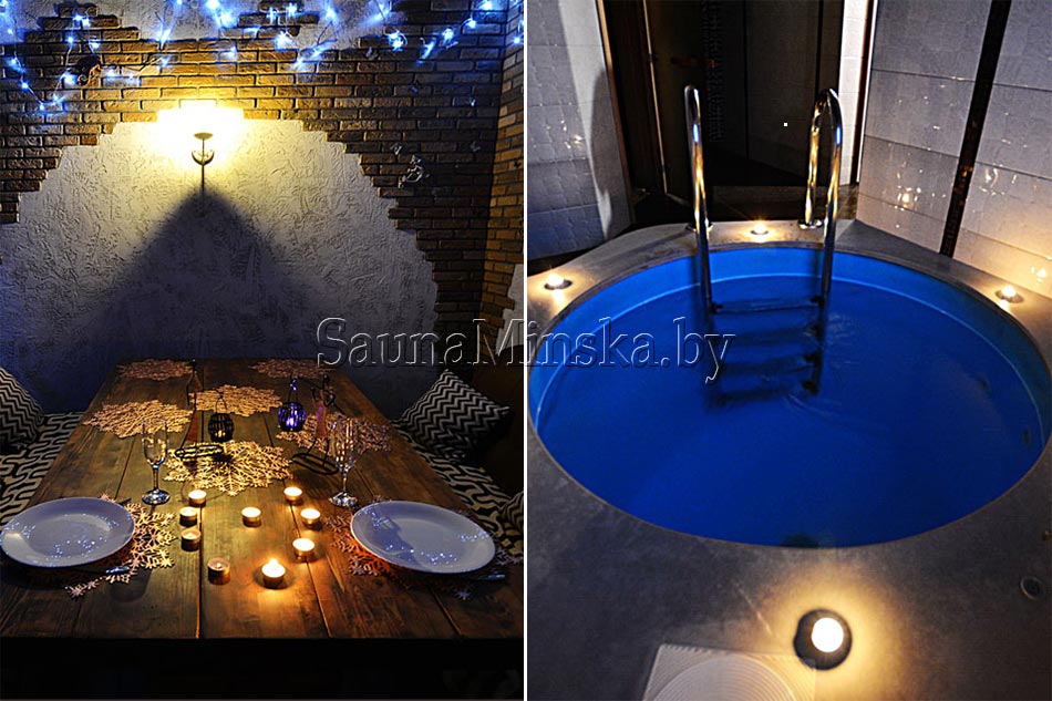 На первом этаже бани находиться уютная комната отдыха с кухней, спа-зона с теплым бассейном и русская парная на дровах.