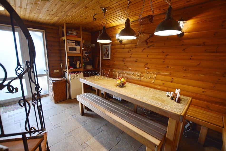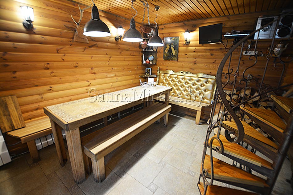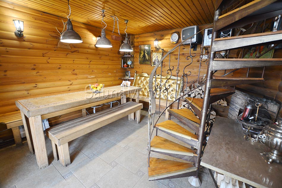 Баня «У Палыча» выполнена из натуральных материалов, создавая определенное настроение для отдыха и парения.
